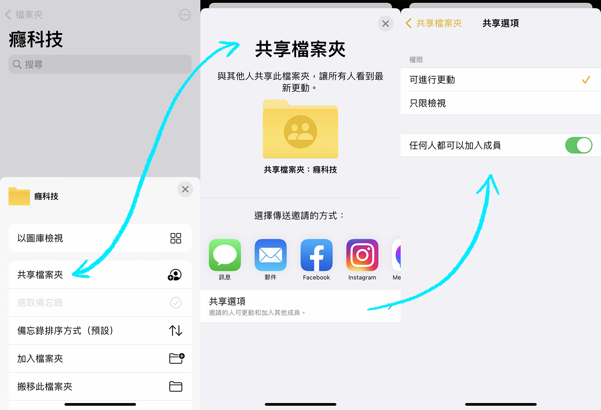 ▲打开备忘录之后,建议先建立分享文件夹,才不会意外分享到不该被看到的笔记。