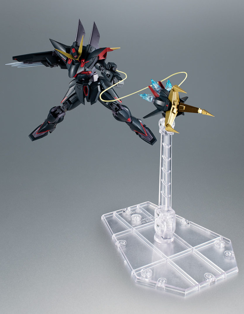 「ROBOT魂 电击钢弹 ver. A.N.I.M.E.」 基于动画设置彻底再现帅气的漆黑装甲、各部推进器与幻象粒子储藏槽,并施以多数更具厚重感的金、银色涂装表现金属质感。 全机运用系列特征的灵活可动机构,包含能与肩关节连动的胸部装甲左右分割、能够大幅前后摆动的腰部、髋关节滑动与小腿的左右摆动等,能够把玩出极为跃动、帅气的战斗姿态!