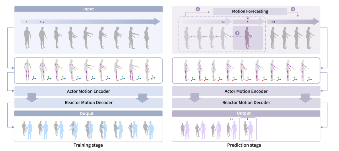 在训练阶段,虚拟人物可以观察到人类的所有动作。 在真实世界的预测阶段,虚拟人物只能观察到人类行为的过去动态。 而提出的预测模块可以预测人类将要采取的动作,以提高虚拟人物的感知能力。 作者使用一个运动预测模块来预测人类行为者的动作和物体的动作。 双人互动中,作者使用了 HumanMAC 作为预测模块。 在双人与物体互动中,作者基于InterDiff构建了运动预测模块,并添加了一个先验条件,即人-物接触是稳定的,以简化对物体运动的预测难度。