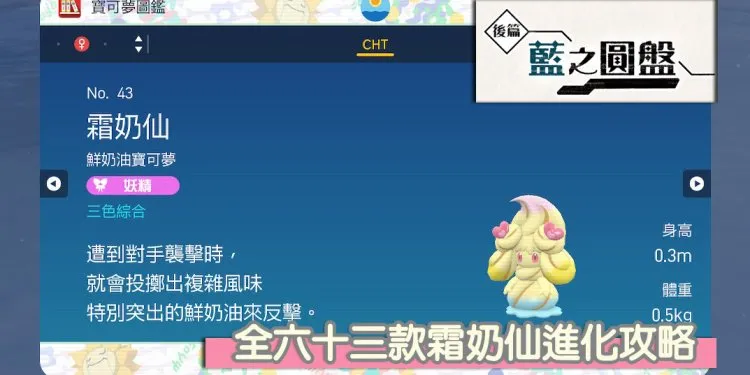 宝可梦 朱/紫 付费 DLC蓝之圆盘的鲜奶油宝可梦-小仙奶,一共有九种进化方式,而且携带不同的糖饰,旋转不同的方向,以及旋转的时间,还有进化的时段,都会影响进化成霜奶仙的样子! 快点一起来搜集63款鲜奶油宝可梦的样子,享受甜品的极致盛宴吧!