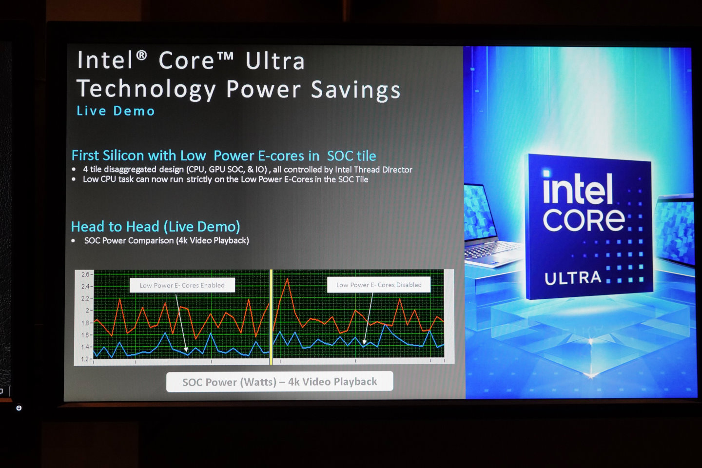 Intel在CES 2024消费电子展期间举办的Workshop坊中展示LP E-Core视频播放功耗、XeSS游戏升频等实机展示。
