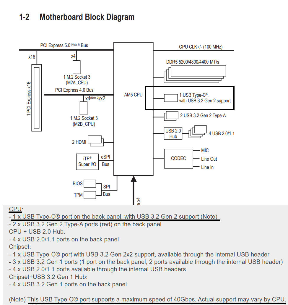 由技嘉提供的官方信息可看到,B650E AORUS ELITE X AX ICE将支持1个40 Gbps的USB TYPE-C,而该USB TYPE-C由CPU提供。 从完整的BLOCK DIAGRAM可看到那个40 Gbps的USB TYPE-C应该是未有占用任何 PCI-E 通道,包括 APU 仍然支持 2 组 M.2 插槽。 笔者也没有发现说明书里有提到USB4 40 Gbps在使用上有可能出现冲突的情况,甚至没有提及是什么CPU/APU才支持USB4 40 Gbps,但留下一句MAY VARY BY CPU。