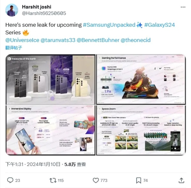 三星Galaxy将于1月18日的全球新品发布会上,发表全新Galaxy S24系列。 不过,近日又有更多关于三星 Galaxy S24 系列手机的爆料传出,以下为 @Harshit66250605 拿到了据说是三星准备用来宣传的素材内容,放上社交平台分享。