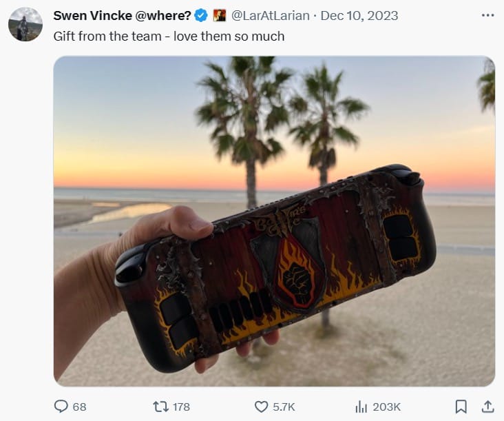 Vincke之所以特别提到Steam Deck,是因为他拥有一台以《博德之门3》炎拳主题为特制的Steam Deck。 这台特制机是由《博德之门3》的开发团队赠送给Vincke的礼物,以表扬该游戏在2023年TGA年度游戏中的优异表现。 Vincke对这份特别的礼物感到非常高兴,并在社交平台上多次分享相关照片。