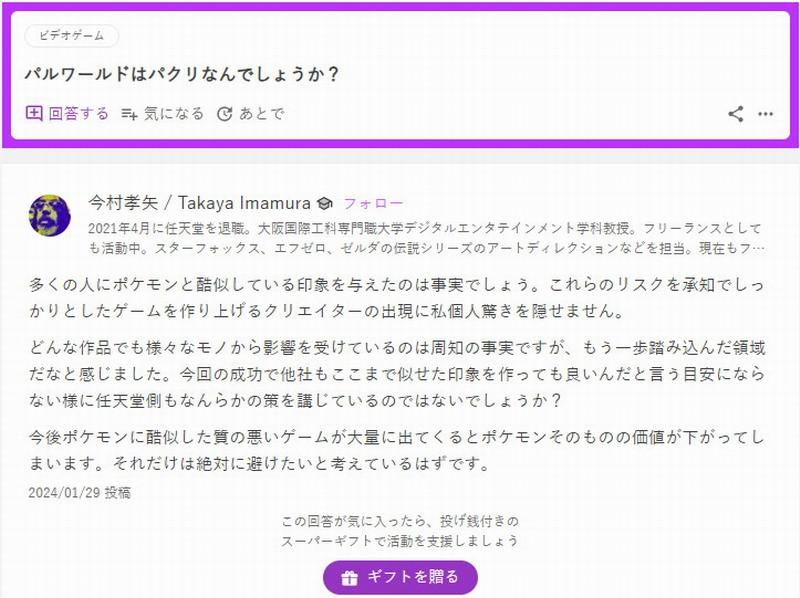 今村孝矢表示:「《幻兽帕鲁》这款游戏给人一种极为类似《宝可梦》的感觉。 对于制作方竟能如此认真地面对这样的风险,我感到相当惊讶。」