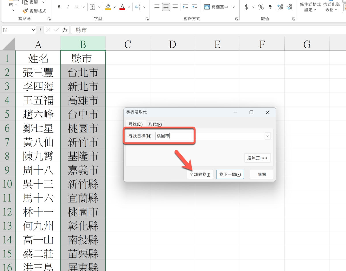 这类等于资料的很简单,只要按下 Ctrl +F 叫出寻找功能后,搜寻对应的资料,比如我们要选取出桃园市,就搜它,然后按下全部寻找。