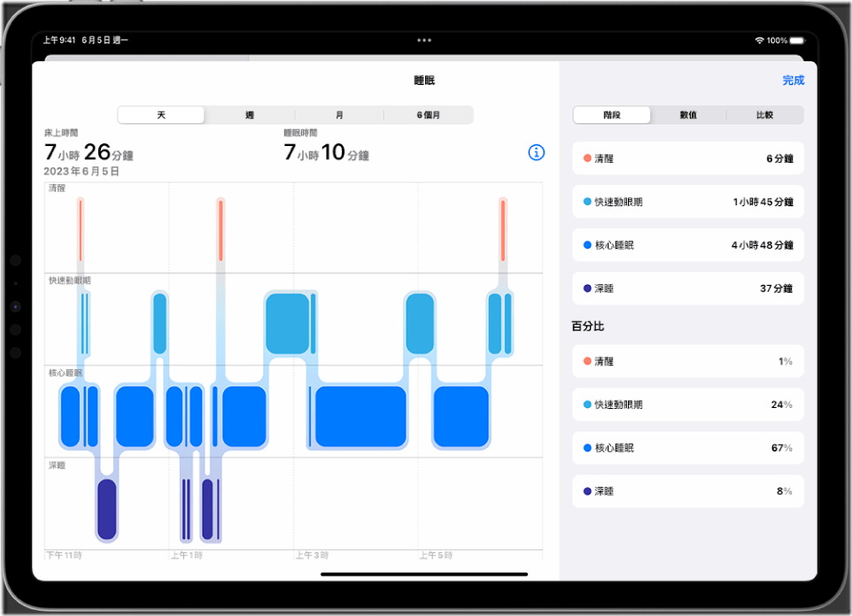 你可以检视最近一天、周、月或半年内的睡眠纪录,在显示更多睡眠资料中,然后选择项目类别,就能看见其他睡眠详细信息。