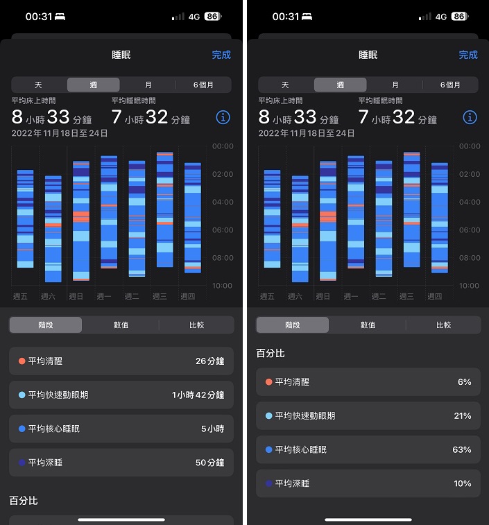 Apple Watch 所记录的信息,也可以回到健康 App 中的「睡眠」功能中查看,以了解自己的睡眠质量。 在记录的睡眠数据中,可以区分出包括速眼动睡眠(快速动眼期)、非速眼动睡眠(相对安稳的核心睡眠)及深层睡眠。 好的睡眠质量中,深层睡眠占 15%、核心睡眠占 50~60%、快速动眼期占 20%。 如果觉得睡好久但又很累,或许会发现是因为都没有进入深度睡眠。