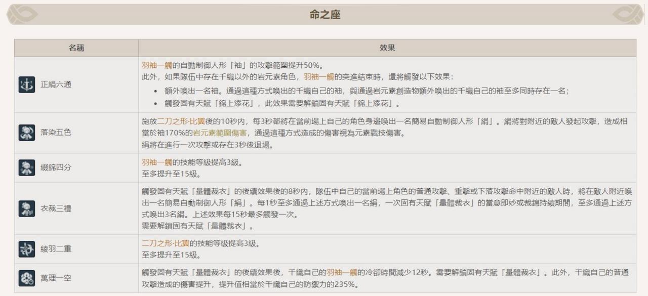 由于千织E技的额外人偶必需要队中有另一个能创造岩元素创造物的角色才能发动,如果队中不包含另一有岩元素创造物的角色,可说是废了千织的一半武功。 有岩元素召唤物的角色有岩主、凝光、钟离、阿贝多和荒泷一斗,换言之0命的千织队伍必需要有以上之一,不然就要放弃额外人偶的伤害了(不是绝对不行,只是未必有太大意义)。