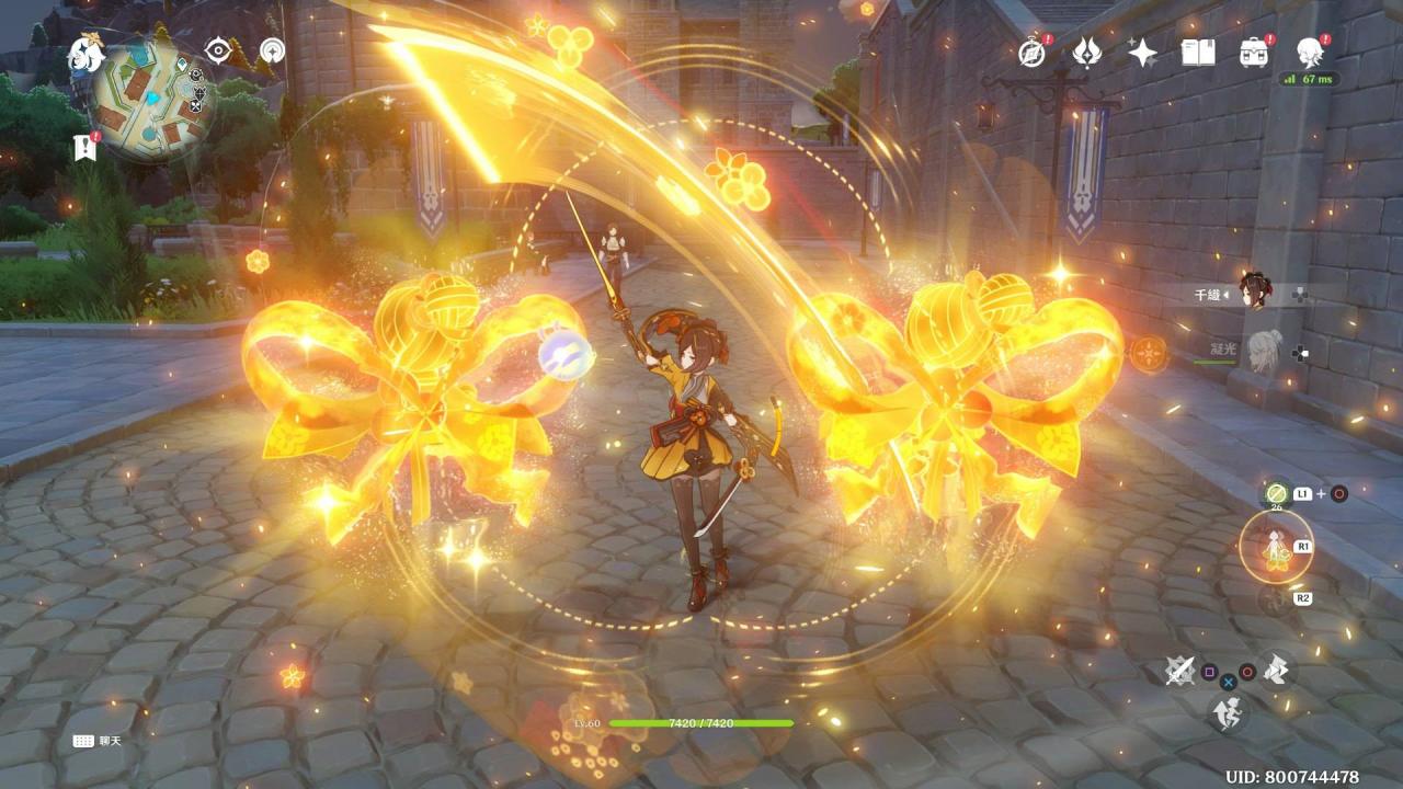 最特别的技能是千织的E技:发动后会冲向敌人打出一发上挑斩(亦可长按E以选择方向)并召唤一个人偶;然后跟据后续输入指令来发动两种不同效果,再按一次E的话会切换至队伍中下一个角色,并且切换出来角色进行攻击时,将会发动额外的协同攻击。 而按攻击就会为千织自己加上岩元素附魔。