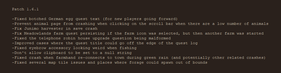 这里所提到的全都是改版内容的九牛一毛,1.6 版本还针对以前的事件做出更新改善,有些是音效、有些是事件与对话、有些是配方与道具相关调整、还有 NPC 的礼物喜好(宝箱变成所有人都喜欢的礼物,除了 Linus)、以及结婚后的一些小事件…