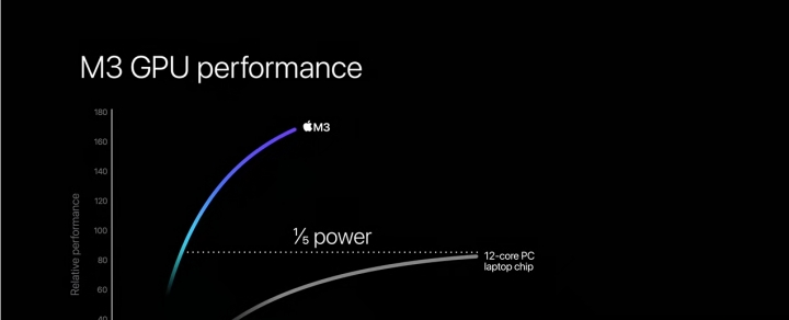▲ 在 M3 系列芯片发布时,苹果也提供相比竞争对手的 GPU 表现,大约仅需五分之一功耗即可达成相同运算效能。