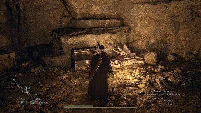 巴克巴达尔继续向下走,会抵达德劳普尼尔大石窟,第一次抵达时要将窟内的石头打掉放水,出洞口后不远处会发现一名叫古斯塔夫的老人,交谈后他会要求提交 3 株花草,花草种类不限,如果没有可在附近寻找。