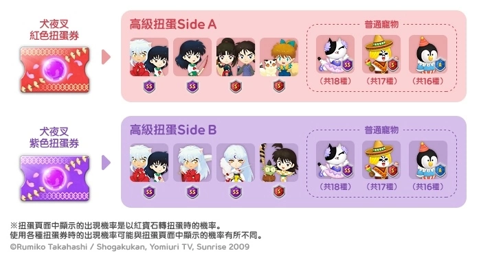 参加游戏内举办的烹饪教室、卡片宾果、宝石箱活动、攻击魔王、世界之旅与兔兔向前冲等各种活动,可获得「犬夜叉红色扭蛋券」和「犬夜叉紫色扭蛋券」,扭蛋券可用来转 2 种扭蛋,其中内含的限定宠物将有所不同。
