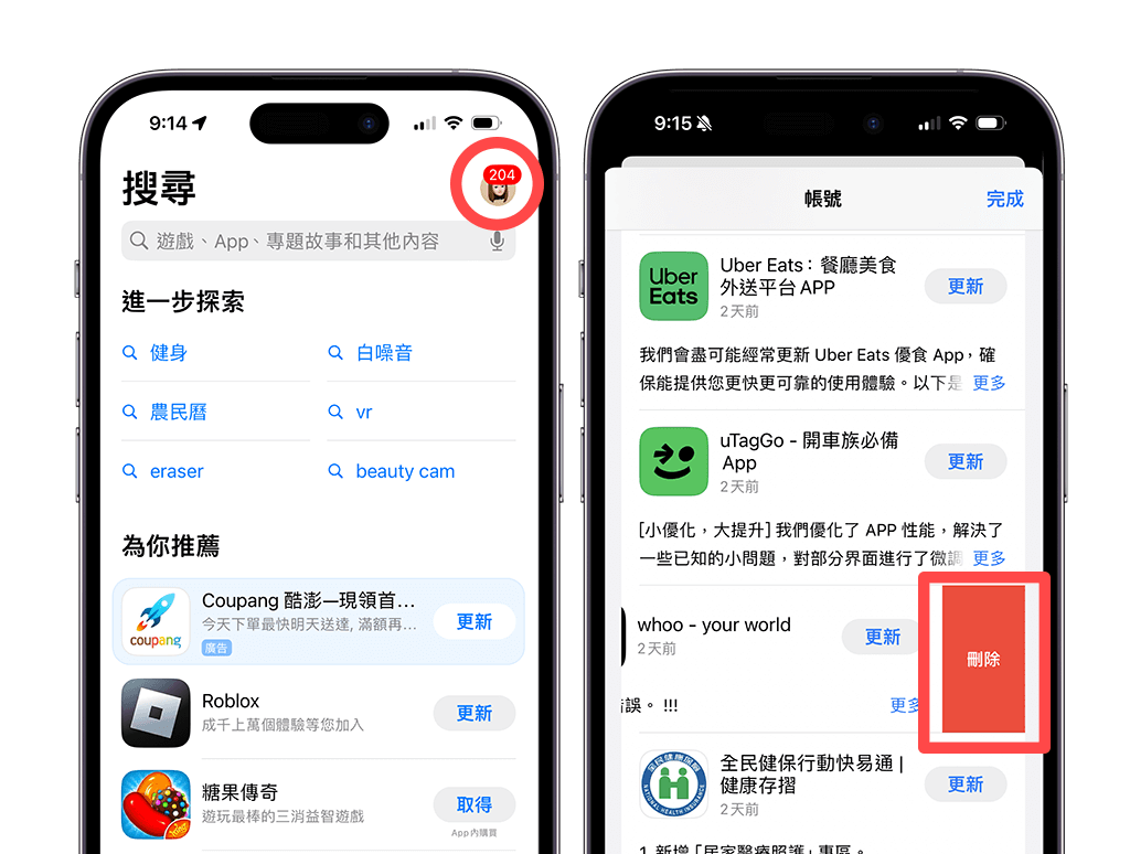 另外还有一个好用的iPhone删除多个App方法就是在App Store上删除,因为App Store里的有记录我们下载的所有App。 请开启iPhone上的App Store,点选右上角个人文件,然后滑到下方,这边就会出现你下载的所有iOS App,我们就依序针对你想删除的多个App左滑删除。