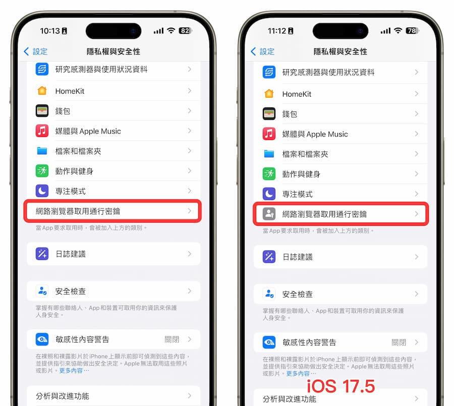 在iOS 17.5更新中也额外替iOS 17隐私权与安全性内的「网络浏览器取用通行密钥」新增iCON图标,相比旧版iOS仅只有纯文字菜单显示。