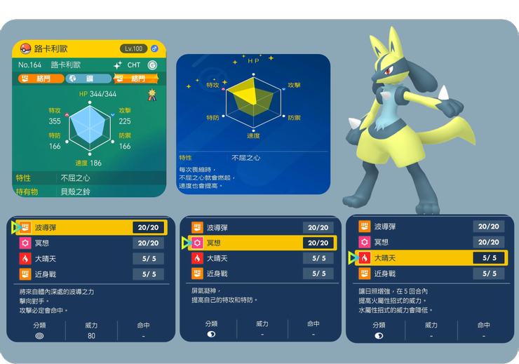 这次使用的路卡利欧是之前用来挑战铁包袱的那一只,需要将太晶属性换成格斗,招式的部份 波导弹、冥想以及大晴天,特性与性格不拘,路卡利欧的颜色,原本的靛蓝色即可,若为黄金路卡利欧更好。