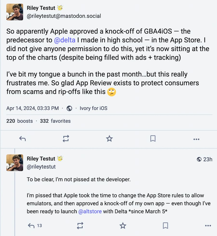 原始 GBA 模拟器开发者 Riley Testut 在 mastodon 平台发文指控,表示从来没有允许授权代码给其他开发者能够上传 App Store ,并怒控 iGBA 开发者 Mattia La Spina 是一款山寨模拟器作品,且还在应用程序内加入广告和位置追踪码,他更气愤苹果 App Store 审查不够严谨,才会导致山寨版模拟器能够顺利上架。