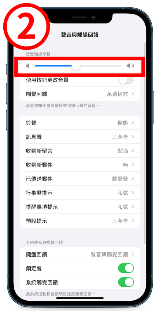 - 步骤(2)、调整「铃声和提示声」下方的音量拉条,向左调整为变小声、向右调整为变大声。