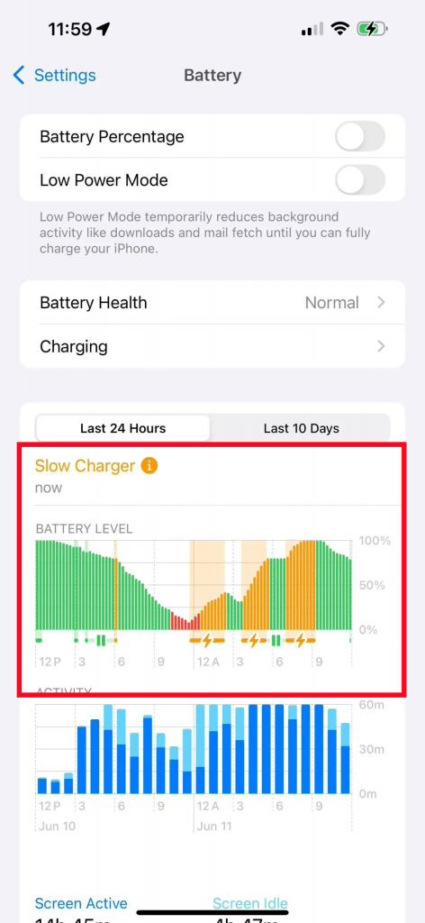 另一项实用的新功能是,iOS 18能够识别用户使用的充电器是否为慢速充电器。在设置应用的“电池”选项中,用户可以查看电池电量曲线图。如果系统检测到用户使用的是慢速充电器,曲线图上将显示一条橙色的警告信息,同时在下方标注“慢速充电器”的字样。