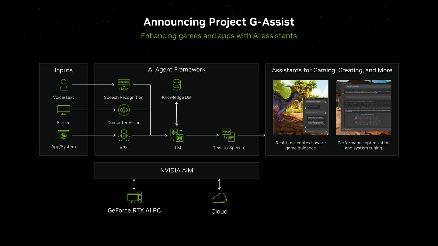 Project G-Assist是款多功能的游戏AI助理,它可以通过语音或文字接收玩家的指令,并撷取、分析游戏画面中的对象,然后同样以语音或文字进行响应,甚至能够协助调整游戏画质、显示卡超频等设置。