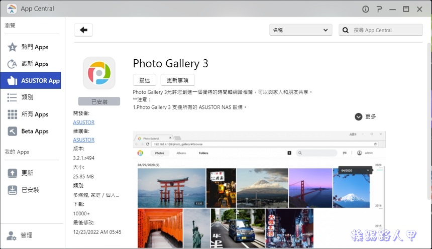 既然NAS式储存资料的地方,当然ADM也提供个人专属的Photo Gallery 网络相簿,通过无远弗届的网络,您就可以将照片随身带着走,匆忙间还能分享生活中的珍贵片刻,如同百度相簿一样轻松地享受云端相簿,不过却没有容量与分辨率的限制。 ADM系统的专属的网络相册应用程序是「Photo Gallery 3」,可到ADM 的「App Central」 安装。