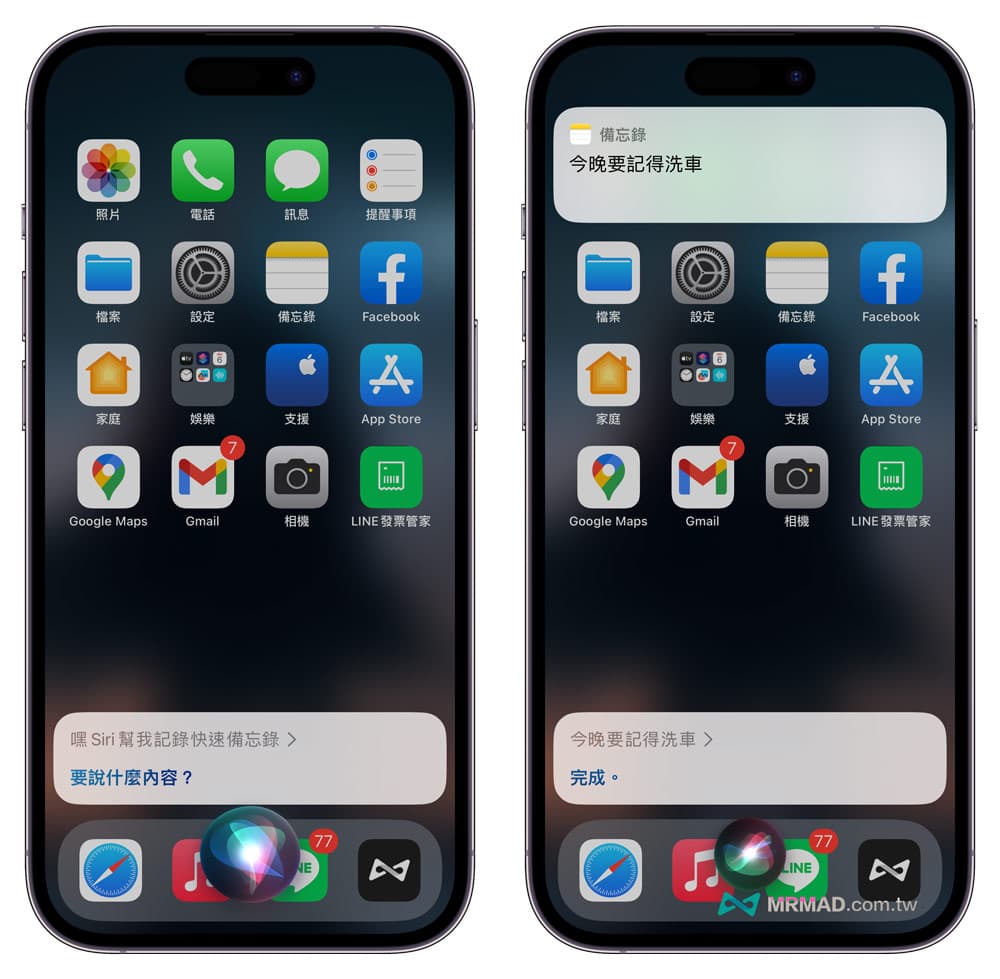 除了可以利用 Safari 外,利用 Siri 也可以实现快速备忘录功能,只要对着 iPhone 说:「嘿Siri~帮我记录快速备忘录」,此时 Siri 会问要说什么内容? 接着说想快速纪录的事情后,Siri 马上会将语音转成文字,直接储存到备忘录 App 内。