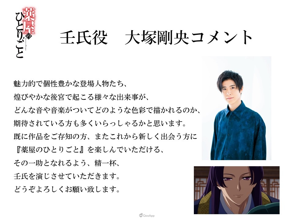 「想必有非常多粉丝期待在动画中,会以什么样的方式与音乐、色彩描绘充满魅力且性格丰富的登场角色们,以及在灿烂华丽后宫中发生的各种事件。 为了让原作的粉丝,以及才刚认识《药师少女的独语》这部作品的读者,都能够尽情享受动画,我将会努力饰演壬氏一角,还请大家多多指教。」
