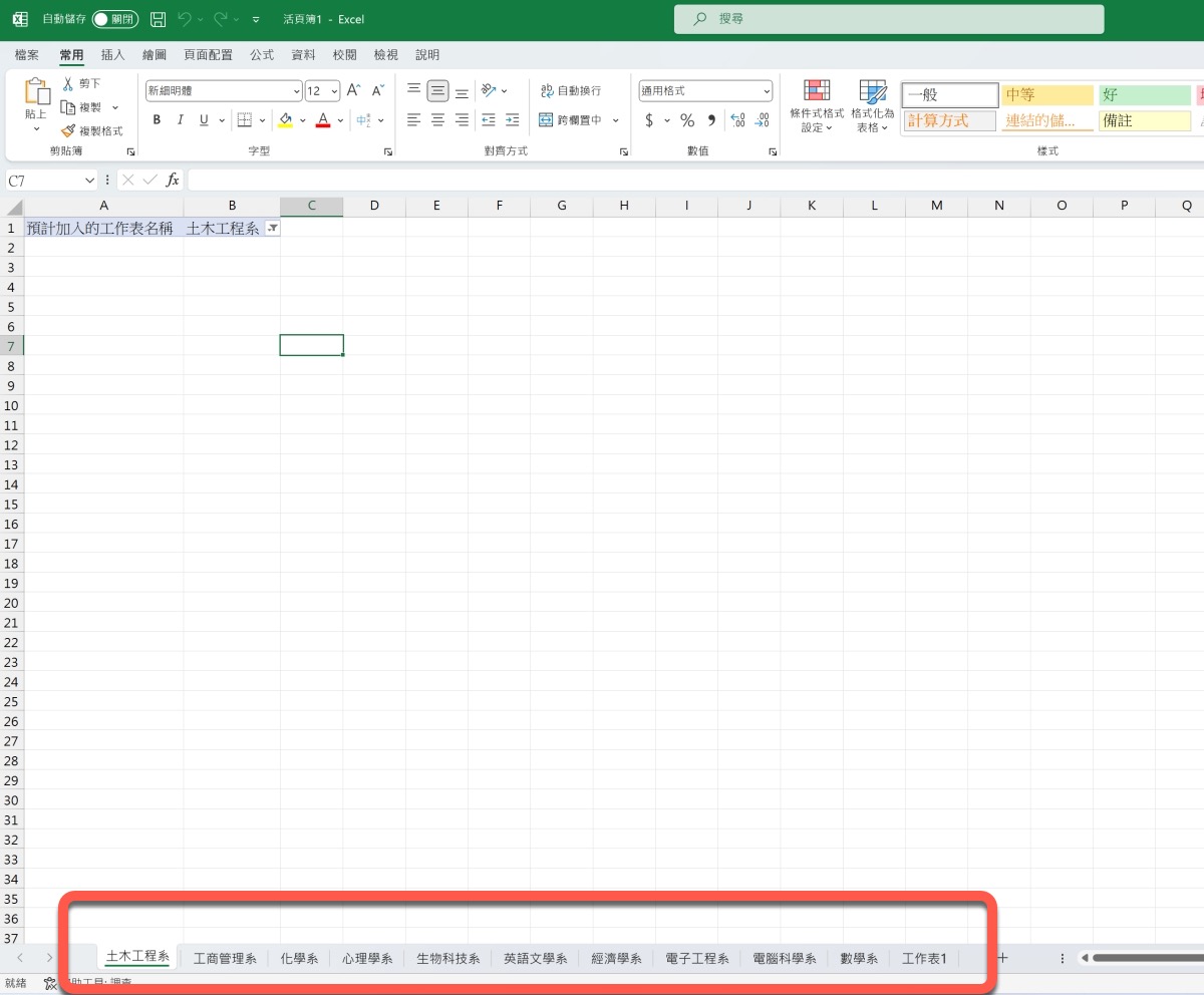首先,我们用科系为范例来制作给大家看,我们想要的是将这些科系各别建立一个新的工作表,而且工作表名称就是以科系来命名。
