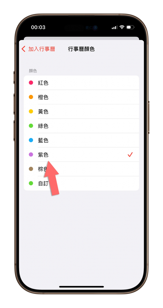 点进去以后就可以选择替这个 iPhone 行事历选择不同的颜色。