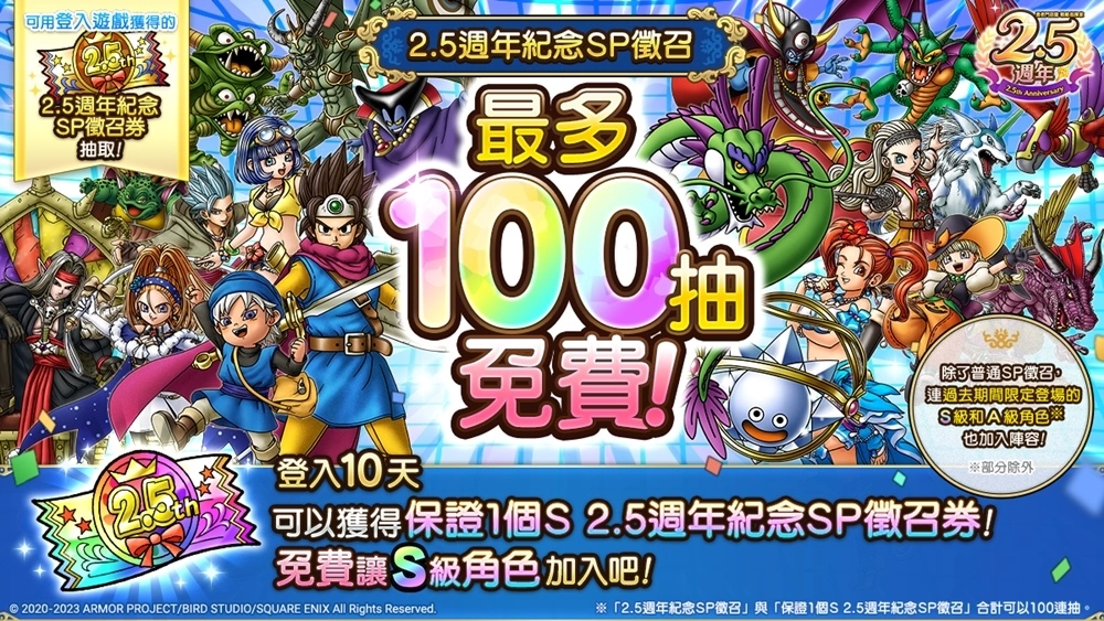 为纪念2.5周年,最多免费100连抽的SP征召登场! 推出期间内登入并获得「2.5周年纪念SP征召券」和「保证1个S 2.5周年纪念SP征召券」,就能分别进行「2.5周年纪念SP征召」、「保证1个S 2.5周年纪念SP征召」。 其中「保证1个S 2.5周年纪念SP征召」必定能让1名S级角色成为伙伴喔!