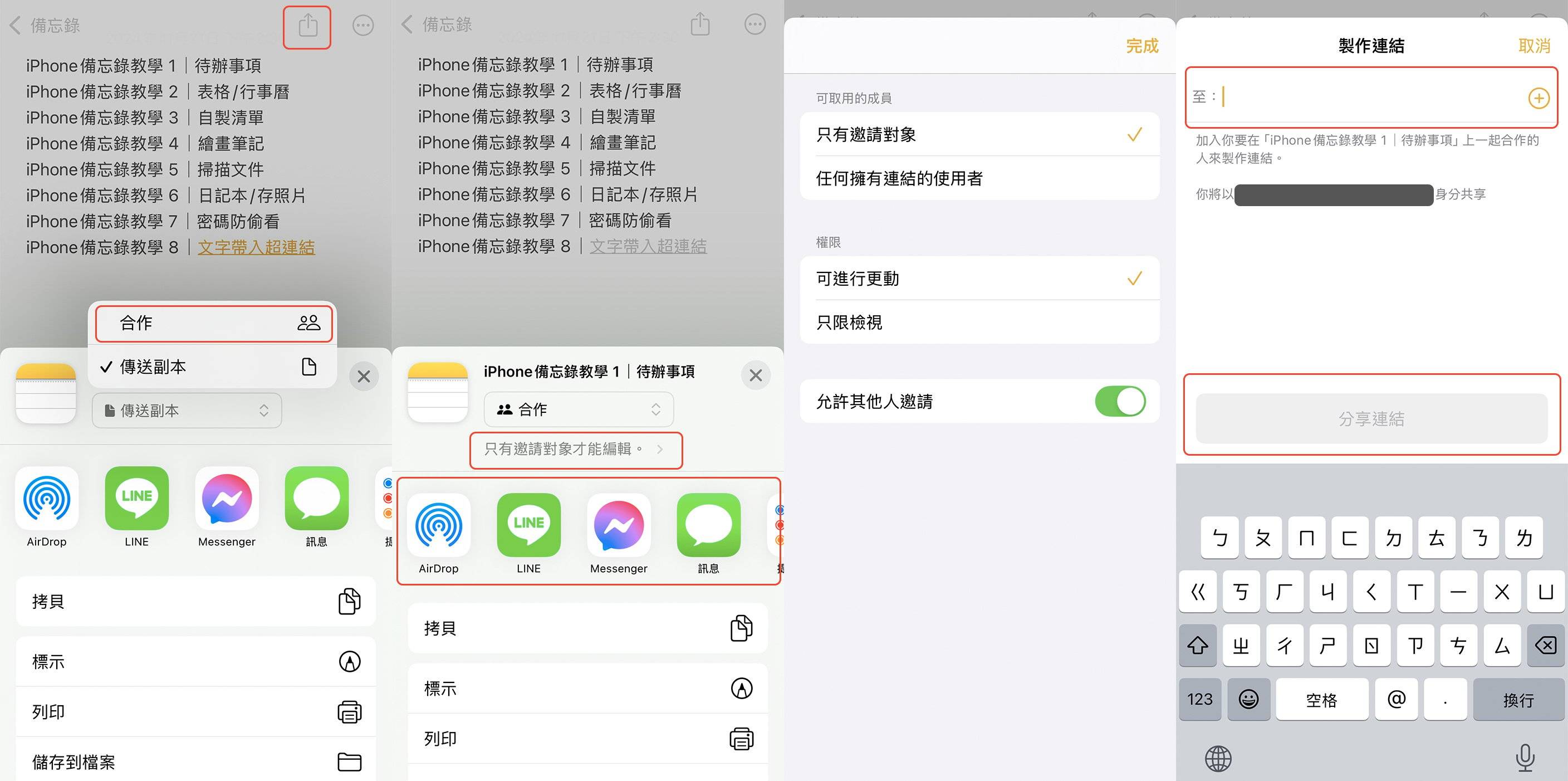 将备忘录储存在 iCloud 文件夹中,不仅可以在 macOS、iOS 系统之间跨设备同步,随时与更新内容,还可以轻松分享给信任的对象共同,非常适合用于规划好友出游的行程安排!