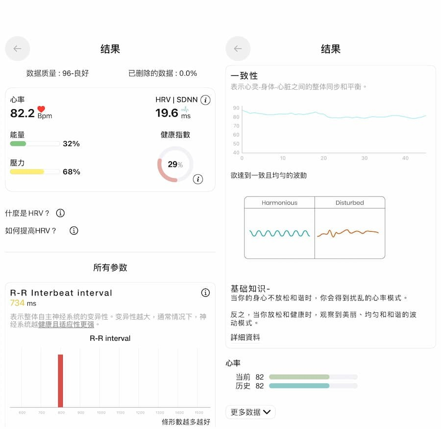 最后也会列出一份心率和HRV数值,同时还会解析依照当前年龄来判断能量和压力指标。