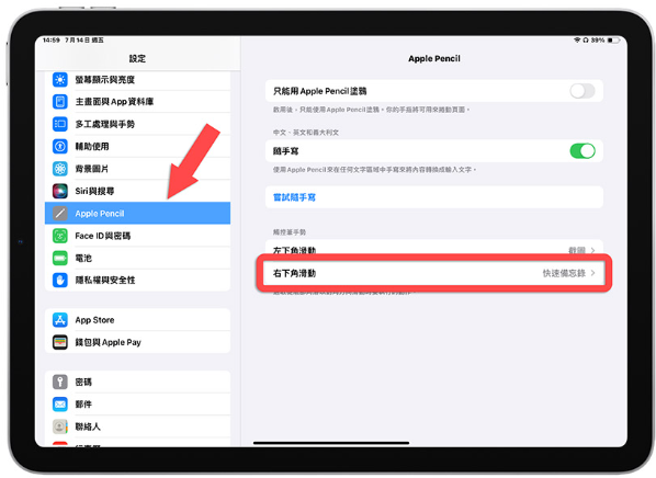 一样是先到「设置」→「Apple Pencil」的选项里面,确认「右下角滑动」被设置为「快速备忘录」的功能。