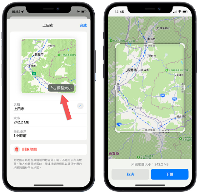 下面还会显示下载这些离线地图资料会占用iPhone 多少的空间,下载的离线地图范围越大、资料越多当然相对的会占用的空间就越多。