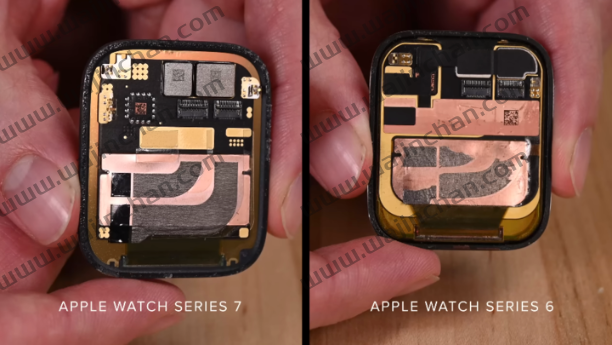要解释这个问题,首先要把Apple Watch S7 和Apple Watch S6 两只手表拆开对比。