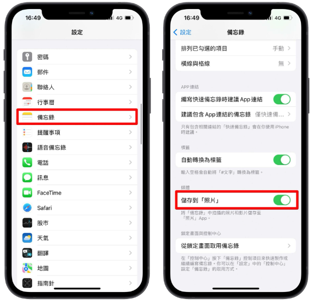 到「设置」中找到「备忘录」这个选项,再向下滑把「储存到照片」功能打开。