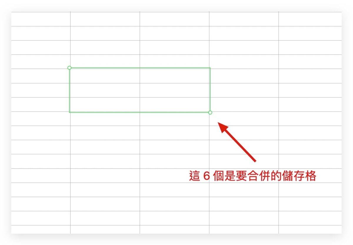 你可以针对相同范围、形成一个完整方形的直栏与横列进行合并单元格的行为,例如下面这样的单元格范围就可以被合并。