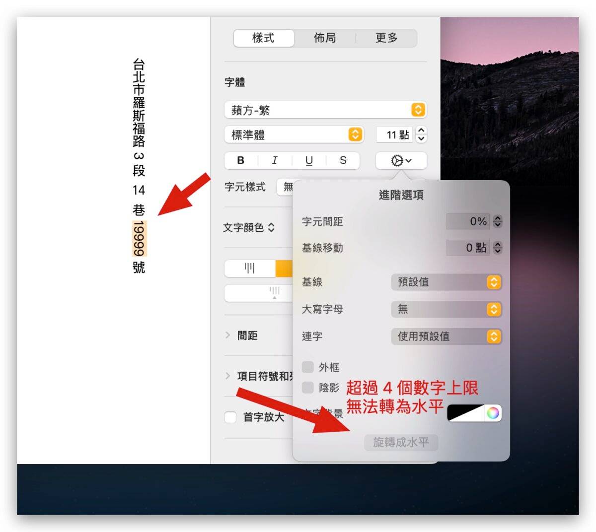 点选以后就可以把这串数字在 Pages 文字直式书写的状态下,以横式水平的样貌呈现。