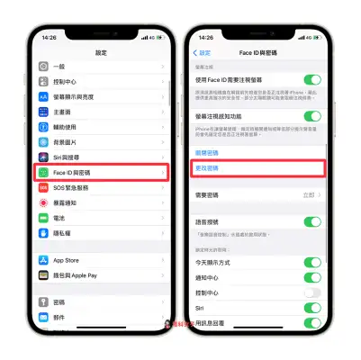更改密码时,你可以点选下方的「密码选项」,自由选择要4 位数密码或6 位数密码,甚至你也可以自定义英数密码或数字密码。步骤如下:开启「设置」点选「Face ID (或 Touch ID) 与密码」点选「更改密码」点选「密码选项」选择「自定义英数密码」、「自定义数字密码」或「4 位数密码」