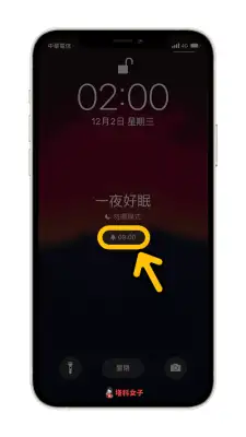 等就寝时间接近时,你的 iPhone 锁定画面就会像下图这样,会显示接下来的闹钟响铃时间: