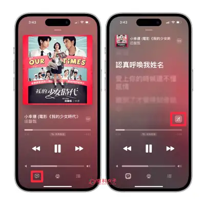 进入 Apple Music 卡拉OK唱歌模式之后,底部的「音乐控制项」会自动隐藏起来,现在你就能看着即时歌词一起唱歌囉!歌词会像 KTV 的卡拉OK一样会即时跑字幕。