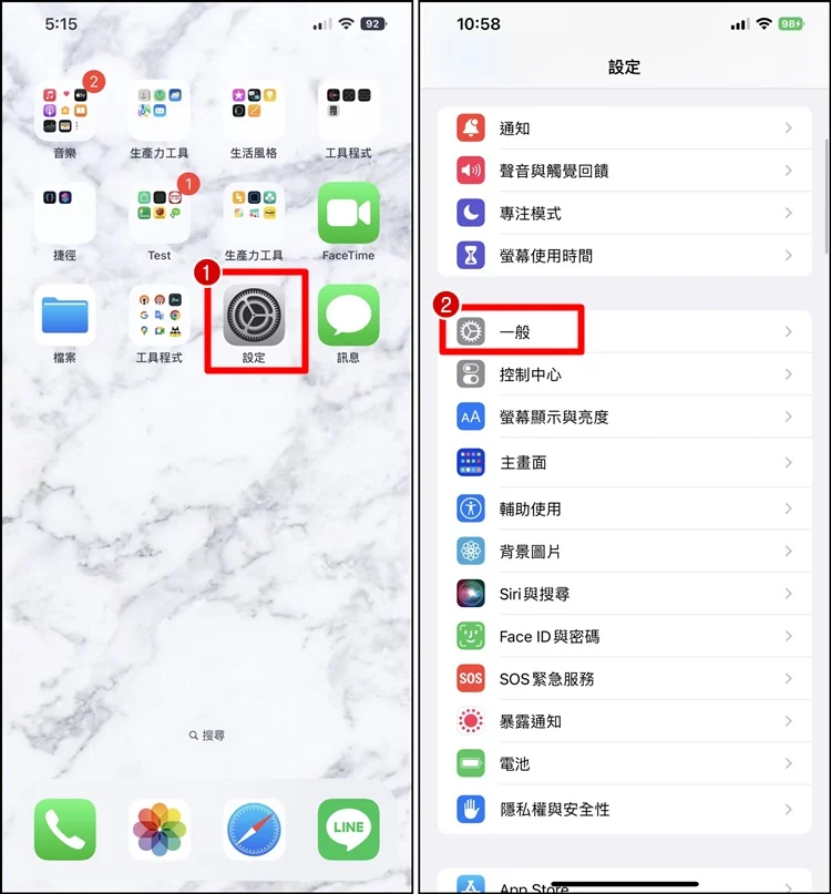 ▼【➀移转或重置iPhone】→【➁重置】