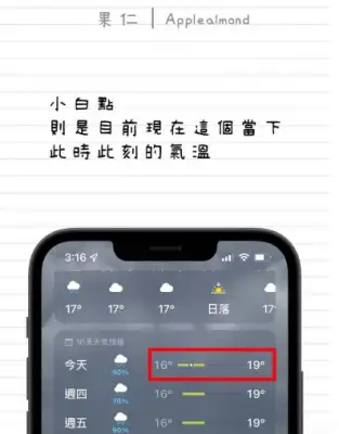 但是通常除非今天的气温温差非常大,小白点才会比较有明显的偏左或偏右的差异,否则像是下图中,最高温19 度最低温16 度,中间也只有17 度与18度的间隔,小白点的左右偏移幅度基本上不会太明显。