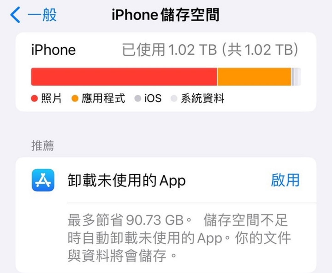 根据果迷分享1TB记忆体被用爆经验,被塞爆主因是手机储存的照片就佔了708.11GB。虽然该网友表示,照片都会上传云端,但可能照片文件太大无法顺利上传云端,导致日积月累卡在手机ROM记忆体内。