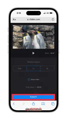 clideo 会自动将视频套用倒放效果,你可以点选播放预览看看,也能调整视频速度快慢,下方的「Mute video」预设会将视频变静音,想要保留声音的话记得要取消勾选。然后点选Export 汇出。