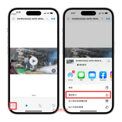 点选左下角「分享」,然后选择「储存视频」,这个视频就会储存到你的 iPhone 相簿里了,现在你可以自由决定是否要在文件 app 里删除该视频。