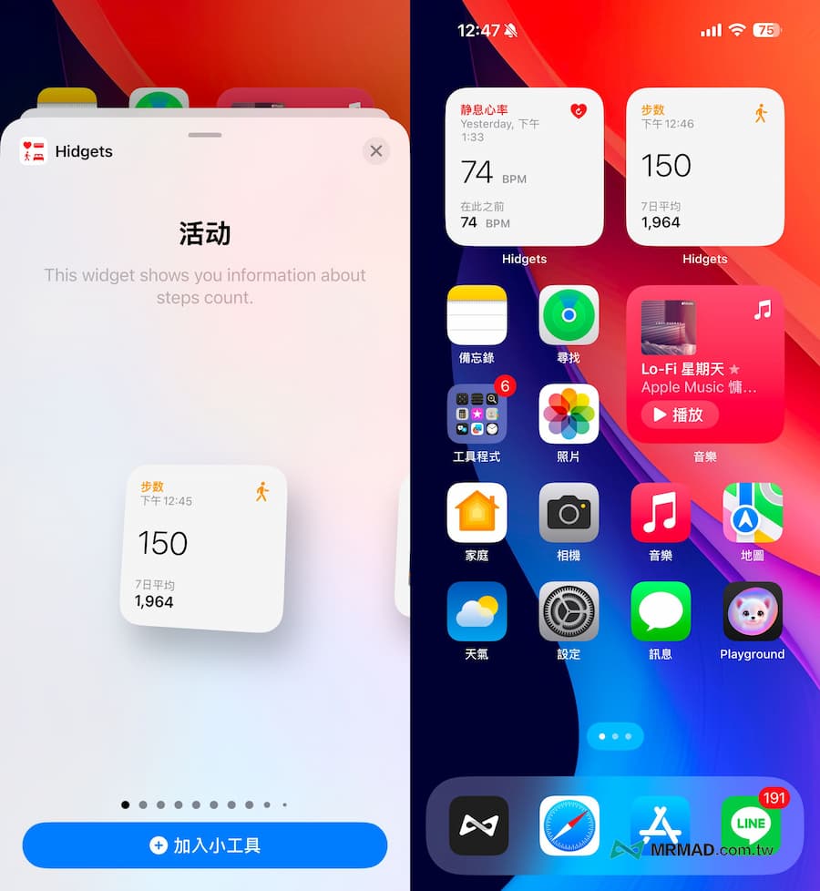 直接长按iPhone主画面空白处进入模式,点选左上角「+」按钮打开小工具,搜寻并选择《Hidgets》,然后挑选适合的尺寸和健康小工具加入到主画面适合位置上。