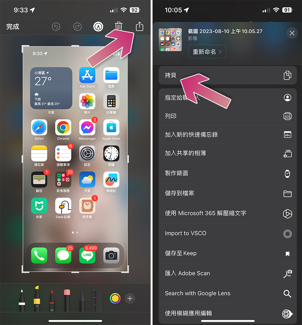 如果你经常同时在两个设备之间切换,则共用剪贴板很有用。对于串连多工处理者,该功能非常有帮助,可让你快速将数据从一个应用程式移动到另一个应用程式,而无需依赖 iCloud Drive 或备忘录等中介平台来转移。举例来说,如果你需要从 Mac 上取用 iPhone 的萤幕截图又不想把自己的相簿填满,只需在截图喀喳声后直接出现在萤幕左下角的小图,于介面中点击右上角的「共用」,然后从清单中选择「拷贝」后,直接在 Mac 要黏贴的地方按下「command + V」即可将截图黏贴到备忘录、邮件或其他文件中,手机上的截图本身则可直接删除。
