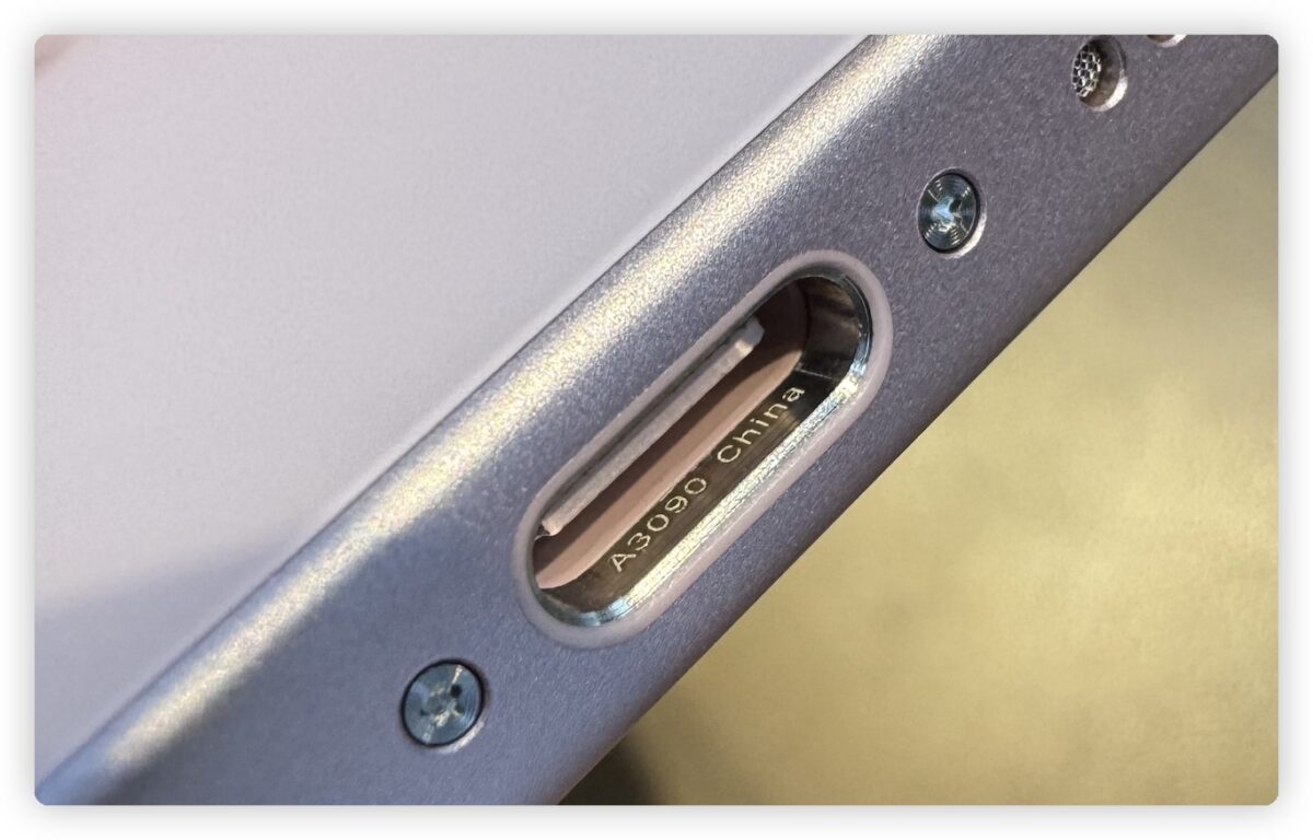 除了 USB-C 接点设计的和机身相同以外,翻个面从机背朝上的角度往 USB-C 孔里面,仔细看会有一排的字,这一排的字上面写着机身的型号以及产地。